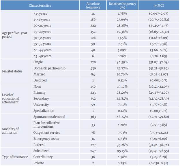 Similarly, the median age of the patients was 23 years (95%CI: 24.49-25.51) and the five-year period with the highest proportion of patients was found in the range of 20 to 24 years. Regarding educational level, the minority of pregnant women had higher education (7.64%, CI95%: 5.88-9.72), while most had only primary or less as the highest level of education (47.51%. 95%CI: 43.97-51.07). It was also noteworthy that although most pregnant women had a partner and lived in a domestic partnership (54.77%, CI95%: 51.21-58.29) or were married (10.70%, 8.62-13.07), a significant proportion of single women was observed (34.39%, CI95%: 31.07-37.83) (Table 1).