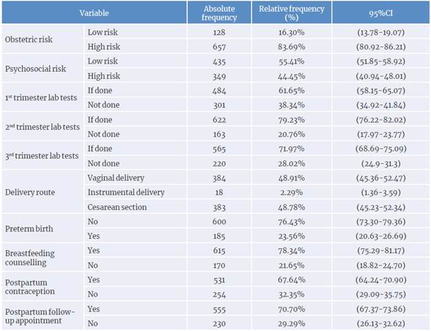 Cross-sectional study. 785 medical records of patients with a gestational age >24 weeks treated at the HUS in 2016 were analyzed. Sociodemographic data were collected, as well as data on the following variables: history of diseases, antenatal care, biopsychosocial risk, and obstetric outcomes. A univariate analysis was performed for each variable; measures of central tendency and dispersion and absolute and relative frequencies were calculated for quantitative and qualitative variables, respectively. Maternal health indicators were also calculated.