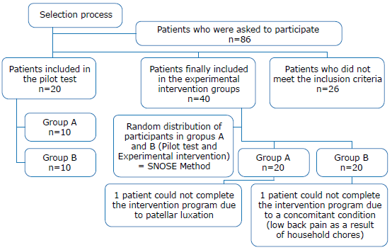 A pilot test was conducted in 20 participants who met the inclusion criteria and expressed their willingness to participate in the study, but they were not included in the final sample due to the size previously established (20 participants per group). It should be noted that all patients who met the inclusion criteria (n = 60) were randomly selected to be part of the experimental study or the pilot test using the sequentially numbered, opaque, sealed envelopes (SNOSE) method,21 and that said method was also used for group distribution. Taking this into account, participants selected for the pilot test were randomly assigned to both intervention groups: A (n=10) and B (n=10). The pilot test lasted 4 weeks and it was used to standardize the strengthening exercise protocol by identifying the degree of difficulty of the exercises, the execution speed, the characteristics of the rest periods to be implemented between each exercise series and the commands to be used to ask participants to start performing each exercise series. It must be noted that none of data collected during this phase was considered for statistical analysis. The prescription of the exercises was adjusted after conducting the pilot test, taking into account the training phases and the principles of the prescription.