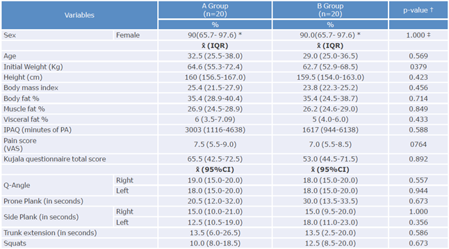 As mentioned above, 40 people with PFPS were randomly distributed into group A (n=20) and group B (n=20); however, only 19 participants of each group were able to complete the intervention program since one person in Group A presented with patellar luxation and a person in Group B withdrew from the study as a result of a concomitant condition that made impossible the proper execution of the exercises. Out of the 40 participants, only 4 (10%) were men; 26 (65%) had normal weight (BMI<25), and 14 (35%) were overweight (BMI≥25). Participants' average age was 32in Group A, and 29 in group B. The basic demographic characteristics of the study population, as well as their baseline (pre-intervention) measurements and scores for each study variable, are shown in Table 1. There were no significant differences between both groups at this stage.