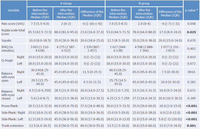 Table 2 shows the differences of the medians (post-intervention changes or differences in pain, knee alignment, core muscles, hip and knee strength, and balance) per intervention group for each study variable measured before and after the intervention.