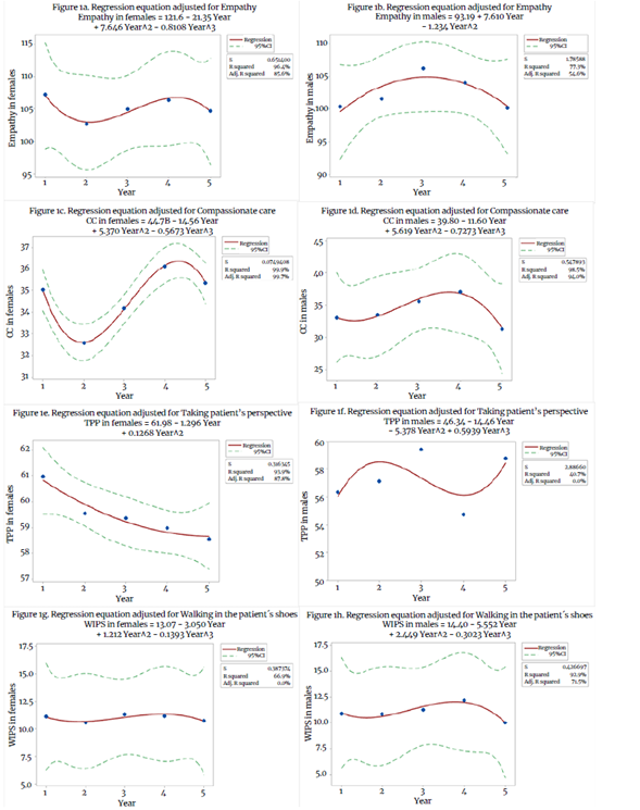 The results of the type of curves in each of the empathy variables studied (i.e., Empathy (E), Compassionate Care (CC), Perspective Adoption (PA) and Walking in the Patient's Shoes (WIPS) by sex are shown in Figure 1.