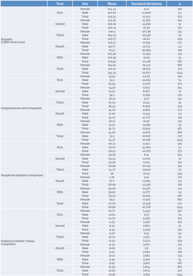 Exploratory cross-sectional study. A Spanish version of the Jefferson Scale of Empathy for Medical Students (S-version) Scale was administered in September 2018 to 1 144 1st-year to 5th-year medical students (887 women and 257 men). Data reliability was verified using the Cronbach's alpha and the intraclass correlation coefficient (ICC). A generalized linear equation model (Type III) was applied to analyze data and the Wald chi-squared test was used to determine differences in overall empathy levels and the mean scores obtained in each of its three components based on the year of medical training and sex.
