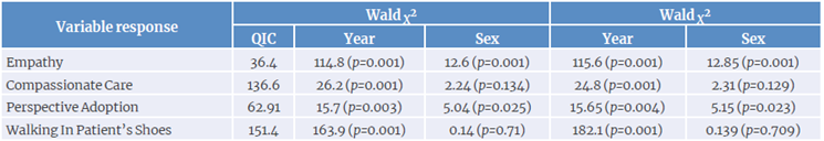 QIC values were acceptable, so the data fit the model used. Wald X2 was highly significant in Empathy and in all components when comparing each of these variables across courses. However, regarding sex, significant differences were found only in Empathy and Perspective Adoption. The total Wald X2 values had the same results described above.