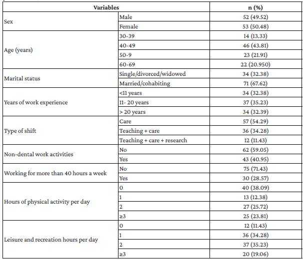 With regard to sociodemographic and occupational characteristics, it was found that 50.47% (n=53) of the participants were women, 43.80% (n=46) were between 40 and 49 years, 67.61% (n=71) were married/cohabiting, 35.23% (n=37) had 11 to 20 years of work experience, 54.28% (n=57) worked only one shift, 59.04%% (n=62) performed only dental work activities, 71.42% (n=75) worked less than 40 hours per week, 38.09% (n=40) did not perform daily physical activity, and 35.23% (n=37) spent 2 hours per day on leisure and recreation activities Table 1.