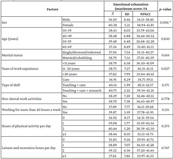 When analyzing each dimension of the burnout syndrome and the behavior of associated factors, it was found that being female was significantly associated with high scores in the emotional exhaustion (p=0.006) and depersonalization (p=0.005) dimensions, while performing a non-dental work activity (p=0.015) and having between 11 and 20 years of work experience (p=0.024) were significantly associated with high scores in the personal accomplishment dimension. The higher levels of depersonalization among women contrasts with the findings of Castañeda-Aguilera et al. 20 in Mexico, who, in their study of 203 dentists from the Guadalajara Metropolitan Area, found that being male was a risk factor for this dimension.