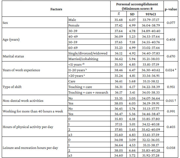 The personal accomplishment dimension was significantly associated with two factors: levels were higher in the group of professionals with 11-20 years of practice (38.46±6.47) compared to those with less than 11 and more than 20 years (35.50±4.85 and 35.24±4.81, respectively) (p=0.024), and in those who perform some type of non-dental work activity (38.05±6.05) compared with those who did not (35.35±5.05) (p=0.015) Table 4. When categorized by level, 34 participants (32.38%) were classified in this dimension at the low level, 34 (32.38%) at the intermediate level, and 37 (35.24%) at the high level.