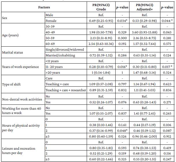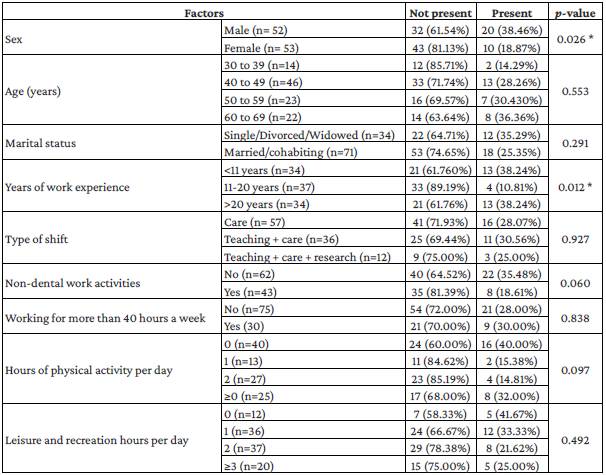 The factors evaluated were: sex, age, marital status, years of work experience (<11 years, 11-20 years, >20 years), type of work shift at the hospital (care, care + teaching, care + teaching + research), working more than 40 hours per week (yes/no), number of daily hours of physical activity and leisure and recreation (0, 1, 2, ≥3), and other working activities (yes/no), with any activity other than clinical-care, teaching and research in the dental area being considered as non-dental.