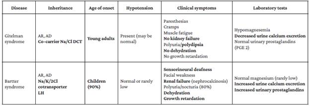 AR: autosomal recessive; AD: autosomal dominant; DCT: distal convoluted tubule; LH: loop of Henle. Note: Major differences are highlighted in bold. Source: Own elaboration based.