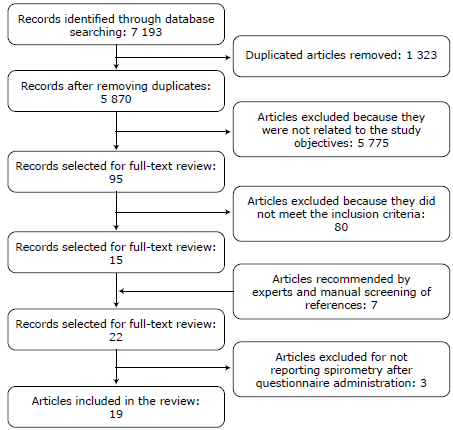 The initial search of the databases yielded 7 193 potentially relevant articles, of which 1 323 were eliminated because they were duplicates, 5 775 because they did not meet the study objective, and 80 because they did not meet the inclusion criteria, for a total sample of 15 articles selected for full-text review. Another 7 articles, which were not considered in the initial search, were included following the recommendations of experts. Of the 22 articles selected for a comprehensive review, 3 were excluded since no spirometry had been performed after administering the questionnaires. Consequently, 19 studies were finally included in the review (Figure 1).
