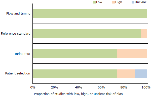 The methodological quality and risk of bias of the selected studies were assessed using the QUADAS (Quality Assessment of Diagnostic Accuracy Studies) instrument, where each of the items was classified as yes, no, or x when the response was unclear. Risk of bias was judged as low, high, or uncertain. If the answers to the guiding questions were yes, the probability of bias was low. In turn, if any of the answers to the guiding questions were no, the probability was high. Finally, if data were insufficient to make a judgment, the probability was uncertain.