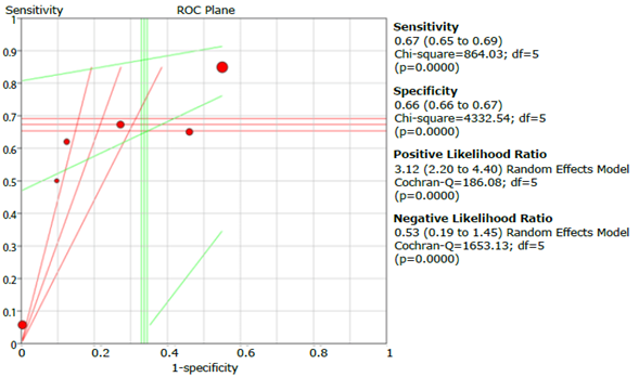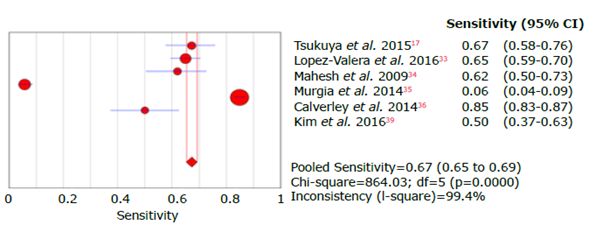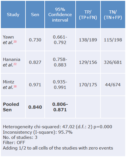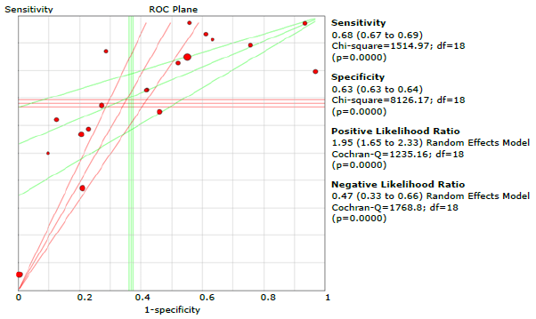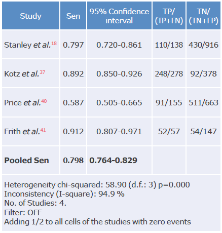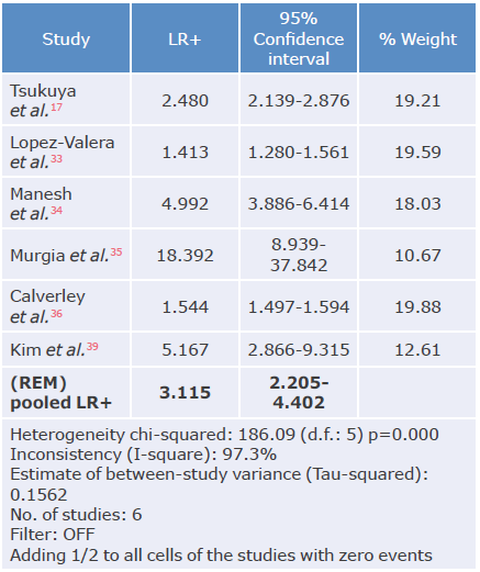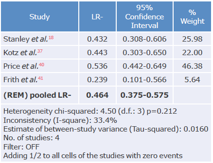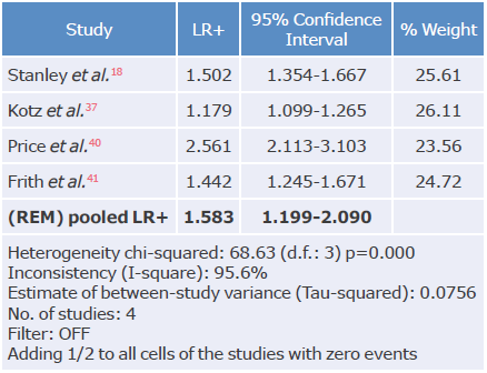 Tables 3, 4, 5 and 6 summarize the sensitivity, specificity and likelihood ratios analyses, and Figures 4, 5, 6, 7 and 8 present the forest plots for those variables.