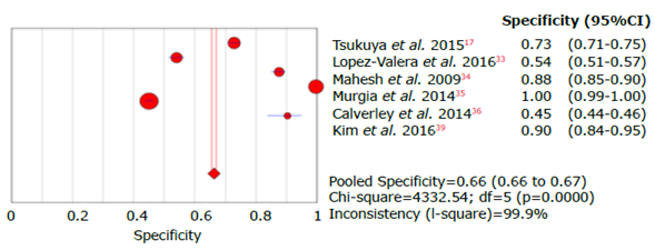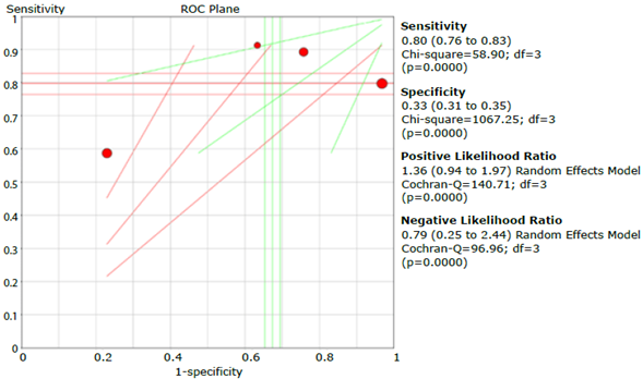 For the meta-analysis of the data, forest plots of sensitivity and specificity were constructed using the statistical software Meta-DiSc version 1.4. These plots were generated to determine the between-study variance and the diagnostic accuracy of each test.