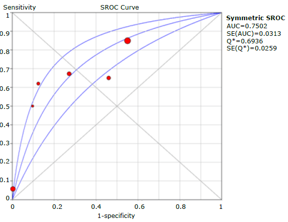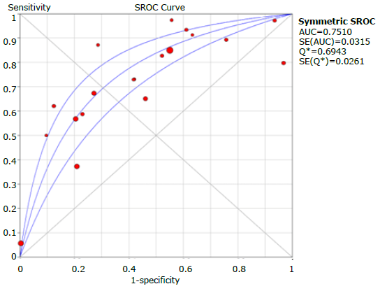 Figure 9 presents the graphic summary of the operating characteristics of the questionnaires used to diagnose COPD, while Figure 10 summarizes the analysis of the receiver operating characteristic curves for the aggregate of the studies; the discriminative ability of the questionnaires was 0.75.