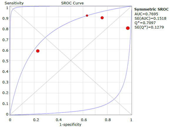To analyze the results, 2x2 tables were created including the corresponding true positives, true negatives, false positives, and false negatives. Likewise, for the meta-analysis, an analysis plan was designed using a hierarchical model with the representation of the summarized ROC curve. Thus, consolidated estimates of sensitivity, specificity, and diagnostic odds ratios (DOR) with 95% confidence intervals (95%CI) were presented.