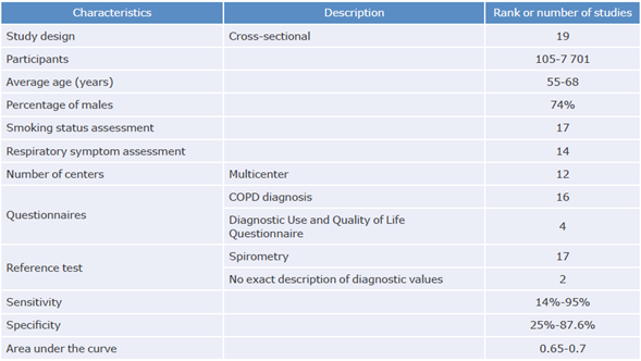 On the other hand, studies conducted in patients previously diagnosed with COPD who had exacerbations, that evaluated quality of life, and that included the diagnosis of other conditions such as lung cancer, or interstitial lung diseases such as sarcoidosis, were excluded. Likewise, studies in which spirometry was not performed after administering the questionnaires or that did not allow obtaining data directly or indirectly for the construction of 2x2 tables with their corresponding positive and negative test results frequencies were excluded.