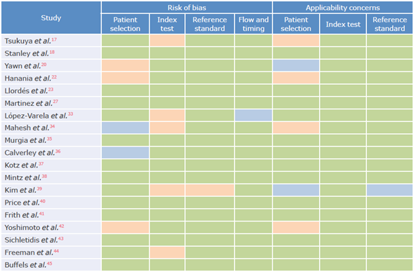 The results of the risk of bias assessment are presented below. As shown in Figures 2 and 3, and in Table 2, the domains where the highest risk of bias was found were reference standard and patient selection.