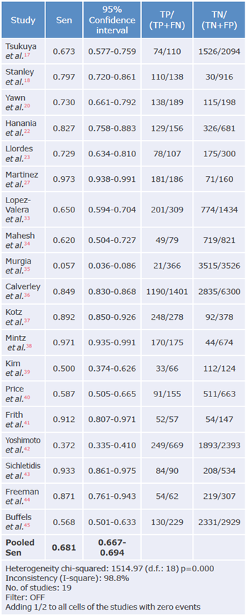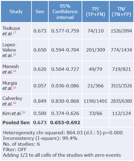 The overall sensitivity was 68.1% (95%CI: 66.7-69.4), with a heterogeneity statistic (I2) of 98.8%; the studies by Martínez et al.27 and Mintz et al.38 reported the highest sensitivity in the questionnaires (97.3% and 97.1% respectively), while Murgia et al.35reported the lowest sensitivity with 5.7%. On the other hand, the The overall sensitivity was 68.1% (95%CI: 66.7-69.4), overall specificity was 64.9% (95%CI: 64.3-65.5), with with a heterogeneity statistic (I2) of 98.8%; the stud- I2 of 99.7%; the highest specificity was reported by Murgia et al.35 with 99.7%, and the lowest by Mintz et al.38 with 6.5%.