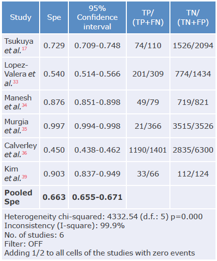 The highest specificity was reported by Kim et al.39 and Murgia et al.,35 90% and 100%, respectively; both studies evaluated the COPD-PS questionnaire in people from the community and outpatients, where the prevalence of the disease may be lower, as well as the respiratory symptomatology reported by patients. In turn, Mintz et al.38 reported the lowest specificity with the LFQ questionnaire in outpatient subjects, which may eventually be explained by the nature of the questions and the differences in the scores.20,38