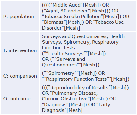 (((((((((("Middle Aged"[Mesh]) OR ("Aged, 80 and over"[Mesh])) OR "Tobacco Smoke Pollution"[Mesh]) OR "Biomass"[Mesh]) OR "Tobacco Use Disorder"[Mesh])) AND ((""Health Surveys""[Mesh]) OR (""Surveys and Questionnaires""[Mesh]))) AND ((""Spirometry""[Mesh]) OR ""Respiratory Function Tests""[Mesh]))) AND (((("Reproducibility of Results"[Mesh]) OR "Pulmonary Disease, Chronic Obstructive"[Mesh]) OR "Diagnosis"[Mesh]) OR "Early Diagnosis"[Mesh]))) AND (((("Cohort Studies"[Mesh]) OR "Longitudinal Studies"[Mesh]) OR "Prospective Studies"[Mesh]) OR "Incidence"[Mesh]) Filters: Publication date from 1997/07/01 to 2017/07/15
