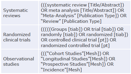 An exhaustive literature search was performed in PubMed, EMBASE and LILACS using the PICO (Patient, Intervention, Control, Outcomes) strategy and MeSH and DeCS terms. Studies published between July 1, 1997, and April 30, 2020, were included. The search strategy is described in Annex 1.