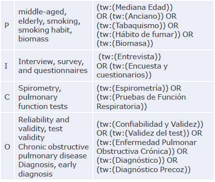 The included studies were conducted in subjects who met the following criteria: being older than 30 years and being exposed to biomass and/or cigarettes, regardless of the number of packages per year; respondents in person to a survey/interview indicating the probability of having COPD, who were inpatients or outpatients regardless of the level of care provided; and patients with a confirmed diagnosis of COPD based on spirometric parameters such as FEV1 (forced expiratory volume in the first second) / FVC (forced vital capacity) <0.7 after using beta-2 receptor agonists (B2), FEV1/FVC6 (forced expiratory volume in 6 seconds) <0.7 after using B2, or FEV1/FVC <0.7 below the normal lower limit.