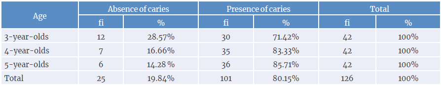 To calculate the prevalence of caries among the participants, the total number of preschoolers with this condition was counted and divided by the total number of preschoolers examined; this calculation was made by groups (3, 4, and 5 years) and for the entire sample.14