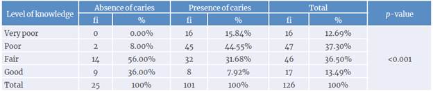 In turn, Cupe-Araujo & Garcia-Rupaya,8 in a study conducted in Lima, demonstrated that the level of knowledge about oral health among parents of children aged 3 to 5 who had caries is predominantly very poor and poor, with both variables being very significantly associated. This is similar to the findings reported in the present research, although it was developed in a geographical area far from Lima.