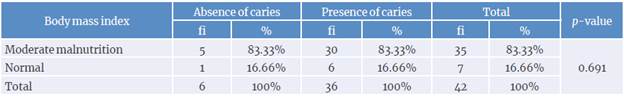 As for BMI, it was established that most participants in the 5-year-old group (n=42), with and without caries, presented moderate malnutrition, so the association between both variables was not significant (p>0.05) (Table 3).