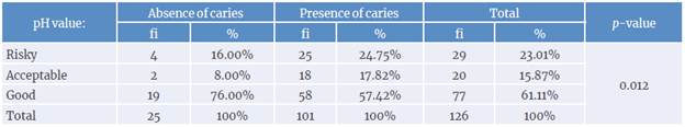 Salivary pH levels in the caries-free group were mostly classified (76%) as good, and these values were higher than those in the caries group (57.4%). Therefore, both variables were significantly associated, that is, the salivary pH value is significantly associated with the presence of caries (p=0.012) (Table 4).