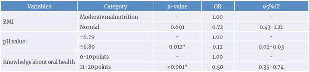 Salivary pH values and parental level of knowledge about oral health were significantly and independently associated with the presence of caries (p=0.012 and p<0.001, respectively). In addition, both were protective factors since the OR (Odds Ratio) were <1: for pH value; an OR=0.12 indicated that those with values ≥6.8 were 88% less likely to have cavities, while an OR=0.5 for parental knowledge indicated that the children of parents with higher knowledge scores were 50% less likely to develop caries (Table 5).