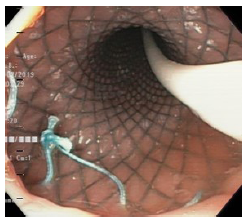 Twelve days after the gastrectomy, a first upper gastrointestinal tract endoscopy (EGD) was performed, which confirmed the clinical suspicion of leakage through the esophagojejunal anastomosis, with a dehiscence of 20% of the circumference (Figure 1). Consequently, treatment was initiated by inserting a self-expandable metallic stent (SEMS) (Figure 2).