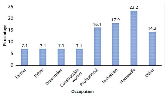 Figure 1: Occupation analysis of the study population. Professional: nurses, engineers, teachers, graphic designers, and lawyers. Technicians: administrative assistants, dental laboratory assistants, food processors, and automotive technician. Other: military, pipeline foremen, mattress manufacturing workers, artisans, quarry workers, guards, freight workers.
