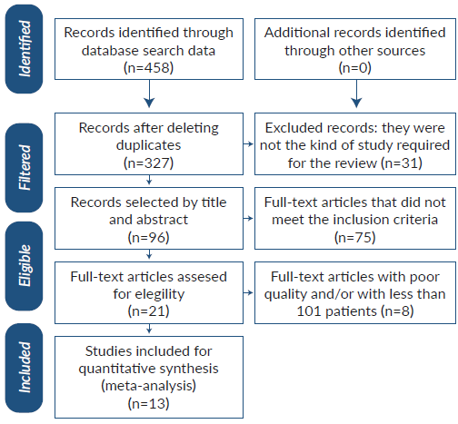 The initial database search yielded 458 results, of which 131 were removed because they were duplicates, 231 were not related to the research subject, 75 did not meet the inclusion criteria, and 8 had poor quality or non-minimum sample compliance (101 patients). Finally, 13 studies were included for full analysis: 1 cross-sectional study, 1 cohort study, and 11 case series, which together described a total of 9 152 patients. Not all variables had the same number of cases, so statistical analyzes were made with the available data. The study selection flowchart is summarized in Figure 1.