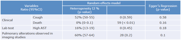 A meta-analysis of all clinical, laboratory and radiological variables was carried out. Table 3 reports the final results and shows the general proportion of the variables that presented heterogeneity <60% and were described in at least 4 articles. The results of the Egger's linear regression test did not show p-values <0.1, so there was no publication bias due to the effect of the small studies. Therefore, this criterion would only be valid for the variables cough, death and pulmonary alterations observed in imaging studies, which were the only ones found in 7 or more studies. In particular, the analysis of the variable death found significant heterogeneity (59%); however, most studies reported mortality <1%.