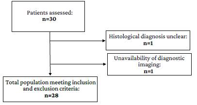 Diagnostic validity study. All pediatric patients who were diagnosed with posterior fossa tumor at the Fundación Hospital Pediátrico de La Misericordia (quaternary care center) between 2017 and 2019 and underwent MRI with DWI sequence that allowed measuring quantitative ADC values (N=30) were selected. Patients whose diagnosis was not confirmed by histological analysis and in whom MRI scans could not be obtained were excluded, leaving a final sample of 28 participants (Figure 1).