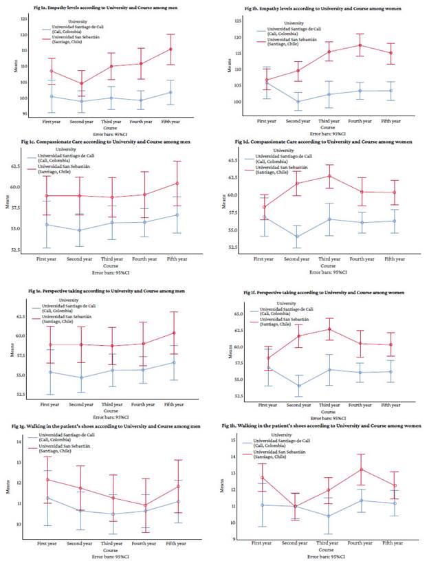 Exploratory cross-sectional study. The study population consisted of 1st-5th year dental students from the Universidad Santiago de Cali, Colombia (n=610; N=647) and the Universidad San Sebastián, Chile (n=535; N=800). In both groups, empathy was measured using the Jefferson Scale of Empathy (S-Version) Scale. Descriptive statistics (mean and standard deviation) were used for data analysis. Internal consistency of data was estimated using Cronbach's alpha and the intraclass correlation coefficient. A factorial analysis of variance was performed, and three factors were studied: University (U), Course (C), and Sex (S). The statistical significance level used was α≤ 0.05 and β ≤0.20.