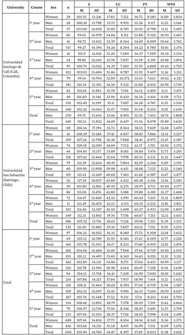 E: empathy; CC: compassionate care; PT: perspective taking; WPS: walking in the patient's shoes; M: mean; SD: standard deviation. Source: Own elaboration.