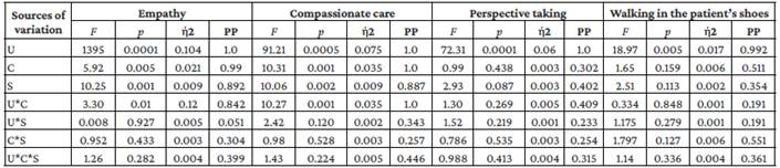 Table 1 presents the means (total and combined by factor) and the standard deviations for empathy and their dimensions at each of the levels of the factors evaluated, as well as the respective interactions of the two populations studied. This same table details partial and total sample sizes for the U, C and S factors, including their interactions (*).