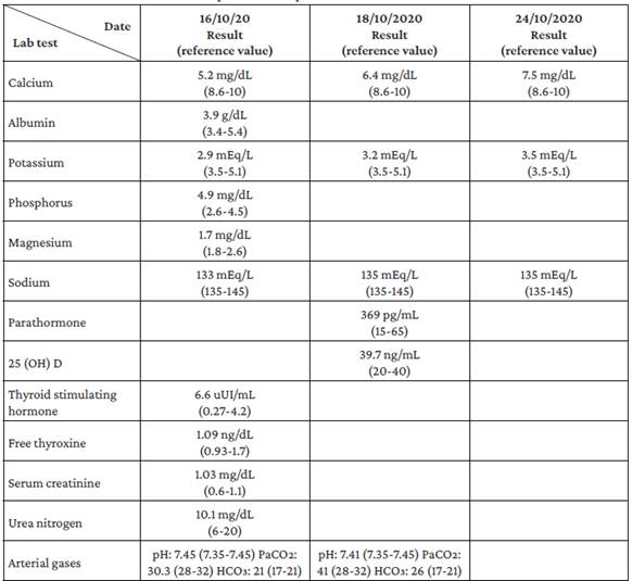 From the first day of hospitalization, the patient required intravenous calcium gluconate (1g every 8 hours), potassium chloride (4 mEq per hour), and magnesium sulfate (2g every 12 hours), but on the fifth day, intravenous calcium and potassium replacement were switched to oral supplement (1.2g of calcium carbonate every 8 hours, 0.5 micrograms of calcitriol every 12 hours, and 10mEq of potassium gluconate every 12 hours), thus achieving a satisfactory progress.