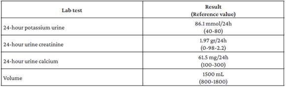It was determined that the patient had PHP type 1b or 2 due to the absence of dysmorphic facies that would raise suspicion of Albright's hereditary osteodystrophy. However, it was impossible to determine the PHP type because a test to measure nephrogenic cyclic adenosine monophosphate (cAMP) levels could not be performed in the hospital. Simultaneously, the patient presented with metabolic alkalosis, increased renal potassium losses, hypocalciuria, and normal blood pressure (Table 2), so GS was suspected, although it could not be confirmed because the necessary genetic tests were not available at the hospital where he was treated.