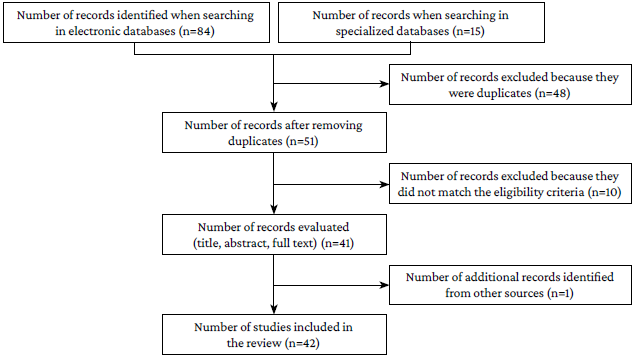 A total of 99 studies were retrieved after the initial search, 84 in the 4 electronic databases and 15 in the specialized databases, of which 41 met the inclusion criteria. One additional record was included due to its relevance to the objective of the review. The studies included were original articles (n=28), review articles (n=6), books (n=5), book chapters (n=2), and undergraduate theses (n=1). Regarding the language of publication, 25 (59.52%) were published in English and 17 (40.48%) in Spanish.