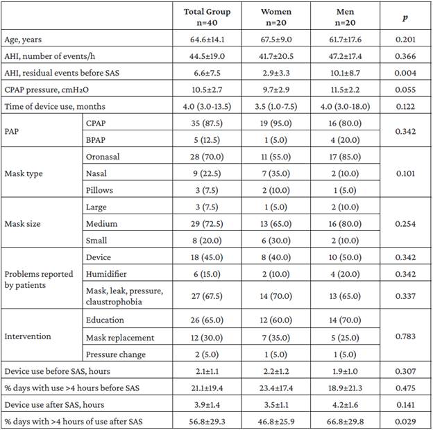 SAS: standardized adaptation session; AHI: apnea hypopnea index; PAP: positive airway pressure; CPAP: continuous positive airway pressure; BPAP: bilevel positive airway pressure. Values presented as mean ± DE, median (P25 - P75), or N (%). p=differences between men and women. Source: Own elaboration.