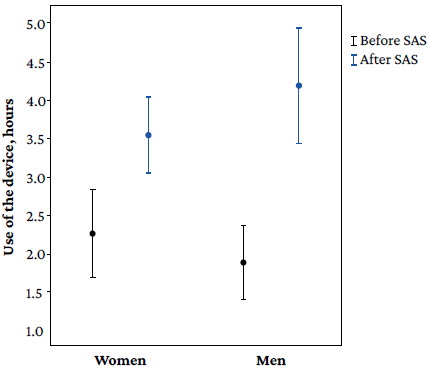 There was a significant improvement in the hours of use of the device in both men (p<0.001) and women (p=0.001), as well as in the percentage of days of use >4 hours in men (p<0.001) and women (p<0.001). However, the improvement in hours of use was greater in men (p=0.023), as well as the percentage of use >4 hours (p=0.029) after the SAS (Figure 1). There were no significant differences regarding the hours of PAP device use between participants with PAP device use for more than 6 months and those who had only used it for less than 6 months (p=0.627).