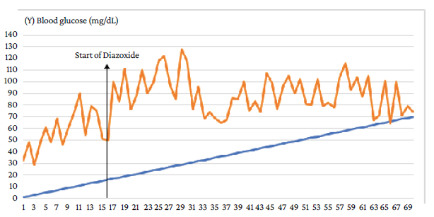 Figure 2: Daily blood glucose levels of the patient during hospitalization. Response to treatment with diazoxide.