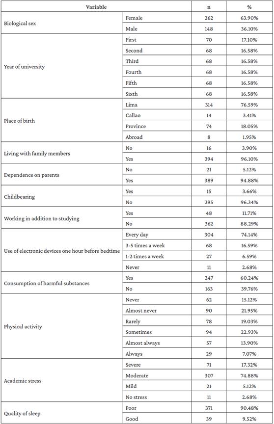 Analytical cross-sectional study carried out in 410 medical students from the School of Human Medicine of Universidad Ricardo Palma, who, in October and November 2020, were administered the Spanish version of the Pittsburgh Sleep Quality Index, the SISCO SV-21 Academic Stress Inventory, and a sociodemographic and habits questionnaire via Google Forms. Bivariate and multivariate analyzes were performed to identify factors associated with poor sleep quality and academic stress, using prevalence ratios (PR) with a 95% confidence interval and a significance level of p<0.05.