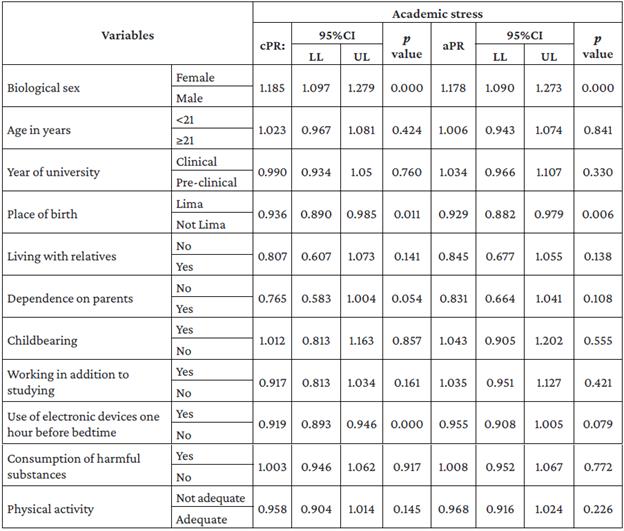 Furthermore, Table 3 shows that the variables associated with academic stress through bivariate analysis were female biological sex (p=0.000), place of birth Lima (p=0.011), and use of electronic devices one hour before bedtime (p=0.000), while the associated variables in the multivariate analysis were female biological sex (aPR: 1.178; 95%CI: 1.090-1.273; p=0.000) and place of birth Lima (aPR: 0.929; 95%CI: 0.882-0.979; p=0.006).