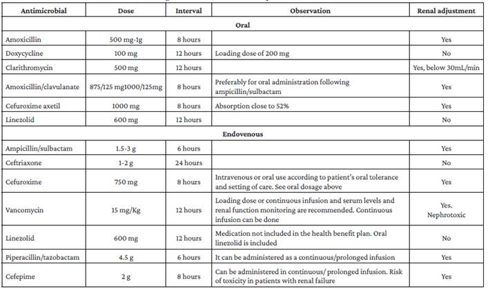 We recommend that the duration of antimicrobial therapy should not exceed 5 days in total and considering the following criteria for discontinuation: clinical stability of the patient (resolution of alterations in vital signs [heart rate, respiratory rate, blood pressure, oxygen saturation, and body temperature]), adequate tolerance to oral administration of food and fluids, and no alteration in mental status (strength of recommendation: strong for; quality of evidence: moderate ⨁⨁⨁◯).