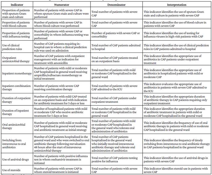 This CPG should be implemented in health centers that provide health care services to adult patients with CAP in order to support activities related to the treatment of this population and programs to optimize the use of antimicrobial agents. Similarly, the indicators presented in Table 6 should be considered to measure the progress of the guideline's implementation, with the frequency and reporting requirements that each institution deems pertinent.
