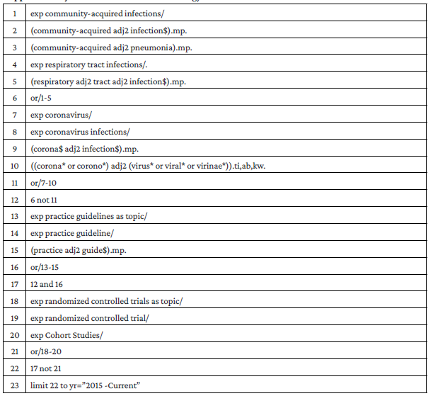 Systematic searches were also performed in MedLine, LILACS and Epistemonikos using search strategies adapted for each search engine and utilizing Boolean, truncation and proximity operators, as well as free-text terms and controlled vocabulary, including key terms such as "community-acquired infections" and "respiratory tract infections". The Medline search strategy is outlined in Supplementary Table 1.